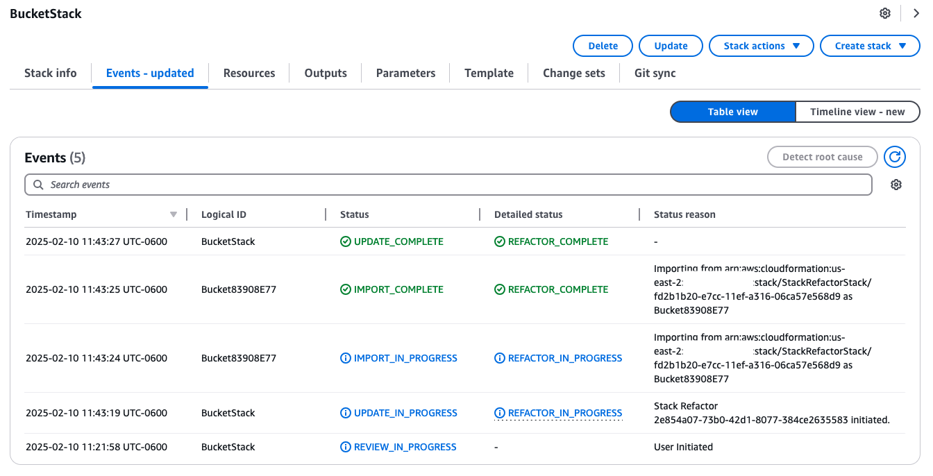 "ExecutionStatusReason": "arn:aws:cloudformation:us-east-2:123456789012:stack/StackRefactorStack/fd2b1b20-e7cc-11ef-a316-06ca57e568d9: Stack was updated.",